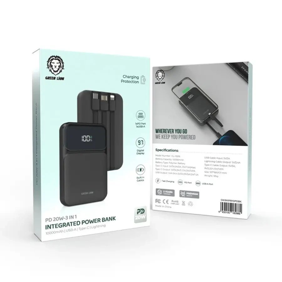 پاوربانک 20 وات گرین لاین Green Lion 3 In 1 Integrated 10000mAh با قابلیت شارژ وایرلسناموجود