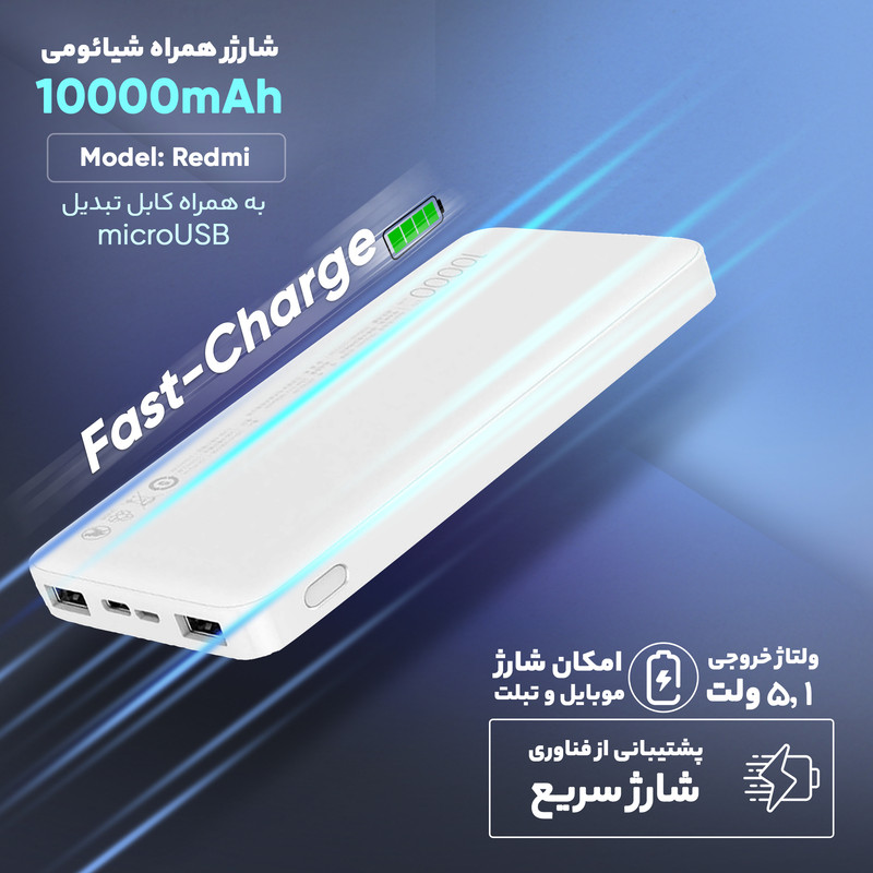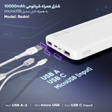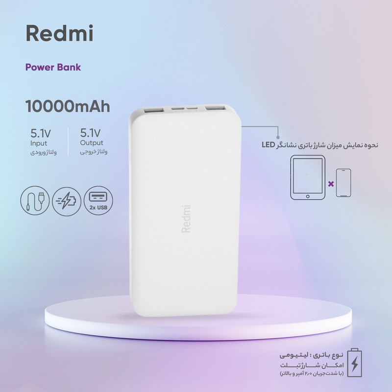 پاور بانک 10000 Redmi مدل PB100LZM ساخت شرکت شیائومی (xiaomi) به همراه یک عدد کابل شارژ 25 سانتی متری است که با داشتن دوپورت خروجی USB و پشتیبانی از انواع پروتکلهای شارژ سریع، بهترین همراه شما در خارج از منزل، محل کار و یا هنگام سفر خواهد بود. این محصول با استفاده از سیستم شارژ هوشمند به راحتی میتواند دو دستگاه را بهطور همزمان شارژ کند. ضمن این که این محصول هوشمند ورودی مناسب را برای هر دستگاه را در نظر خواهد گرفت. این محصول با ابعاد 150x73 سانتیمتر سبک و قابلحمل است و به راحتی میتوانید انواع دیوایسهای خود مانند گوشیهای هوشمند، دوربین، تبلت و غیره را در طول روز شارژ کنید. پاور بانک همراه شیائومی دارای سیستم محافظت در برابر مشکلاتی مانند نوسانات برق، اتصال کوتاه، تغییرات دما، اضافه جریان در ورودی و خروجی و غیره است. این پاور بانک از پورت خروجی دوگانه USB_A و پورت ورودی دوگانه USB-C و MicroUSB برخوردار است. همچنین حداکثر میزان قدرت برای پورت ورودی 5V _2.1A و پورت خروجی آن 5.1V_2.6A است. به علاوه این دستگاه دارای دو درگاه ورودی MicroUSB - TypeC برای شارژ است و قابلیت سازگاری با تمامی گجتهای هوشمند را دارد. در مجموع این پاور بانک با توانایی چندین بار شارژ گوشیهای هوشمند، میتواند یک انتخاب مناسب برای استفاده روزمره باشد.