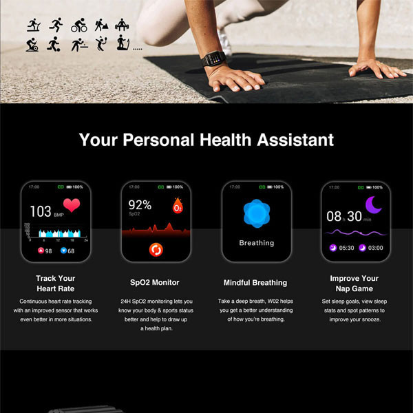قابلیتهای ساعت هوشمند : صفحه نمایش رنگی , صفحه نمایش لمسی , کنترل موسیقی (Music Player) , کنترل سطح اکسیژن خون , قابلیت مکالمه از طریق بلوتوث